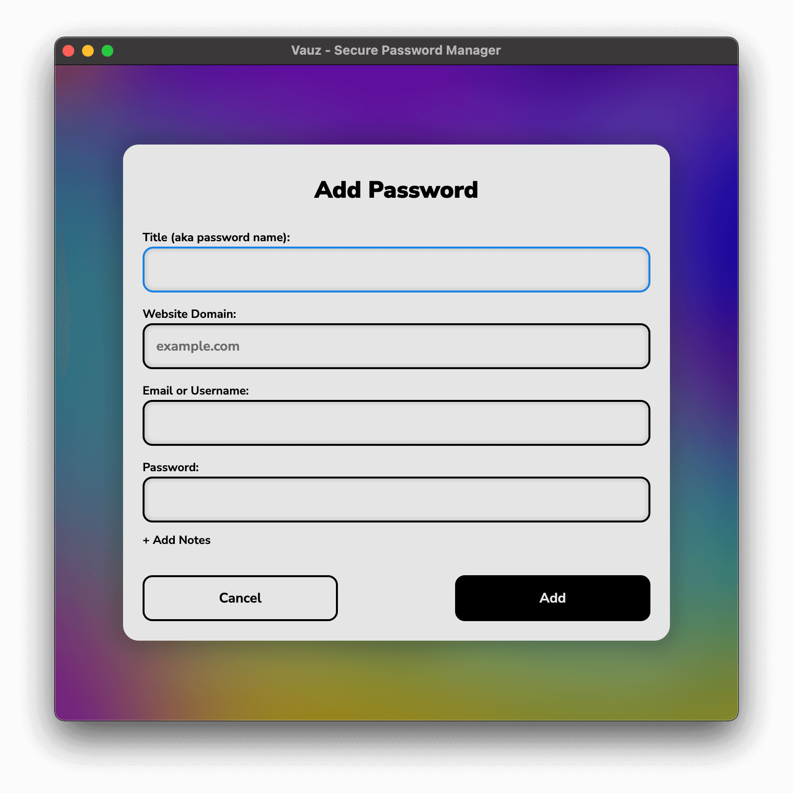 including domain, username/email, and notes fields